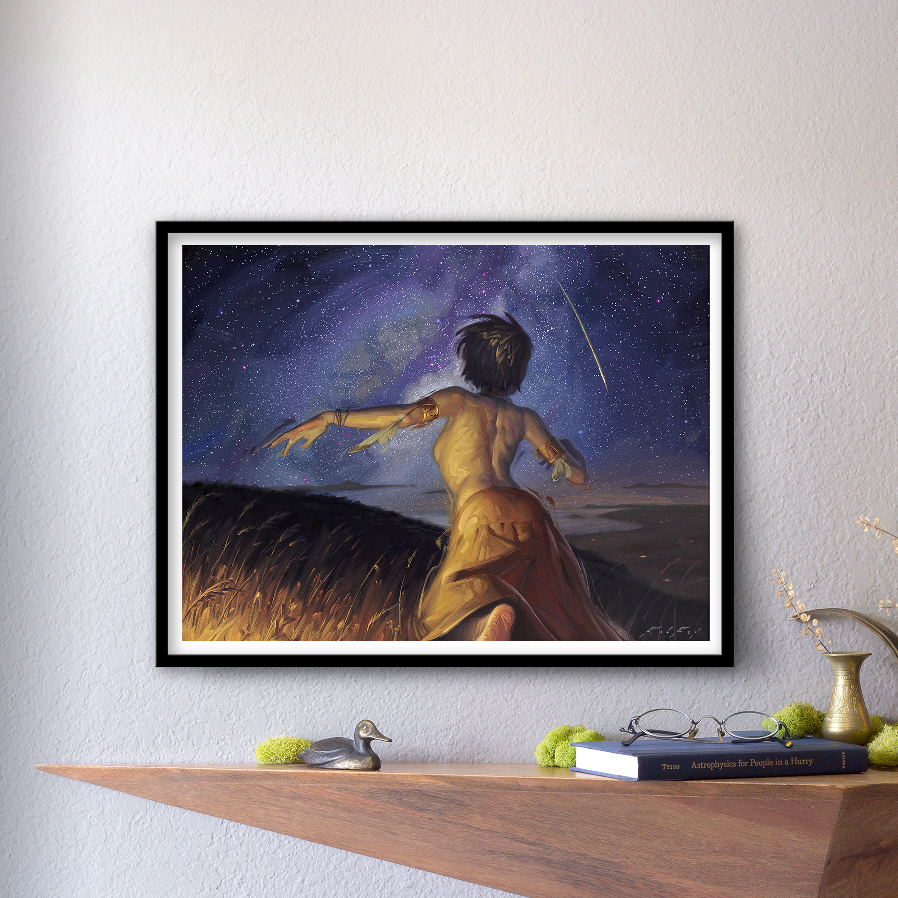 In this image, featuring the Milky Way, I'm hoping to express my appreciation for the natural world. I'm also hoping to express my interest in thinking about how earlier cultures saw and understood the world. For one thing, I like to remember that before electricity and light pollution, the Milky Way was visible from everywhere, and visible every night that the moon wasn't too exceedingly bright. The best starry night sky you've ever seen was the regular nightly show. Now, I'm not disappointed that we have electricity, but what a different experience our ancestors had! I also like to think about what people would have thought of all those lights up in the sky. We tend to take for granted our knowledge that stars are burning balls of gas, and that we know what space is. But, before science told us these things, people could only guess at what all those lights were based on what they saw from hill tops such as this. The astronomer, Carl Sagan, proposed that a star looks not unlike a campfire from a great distance and people may have seen stars as distant campfires of the gods. This thought is one of my main inspirations for this piece. This is the reason I included distant campfires dotting the landscape below as well as the reason for the title "Falling Fire."