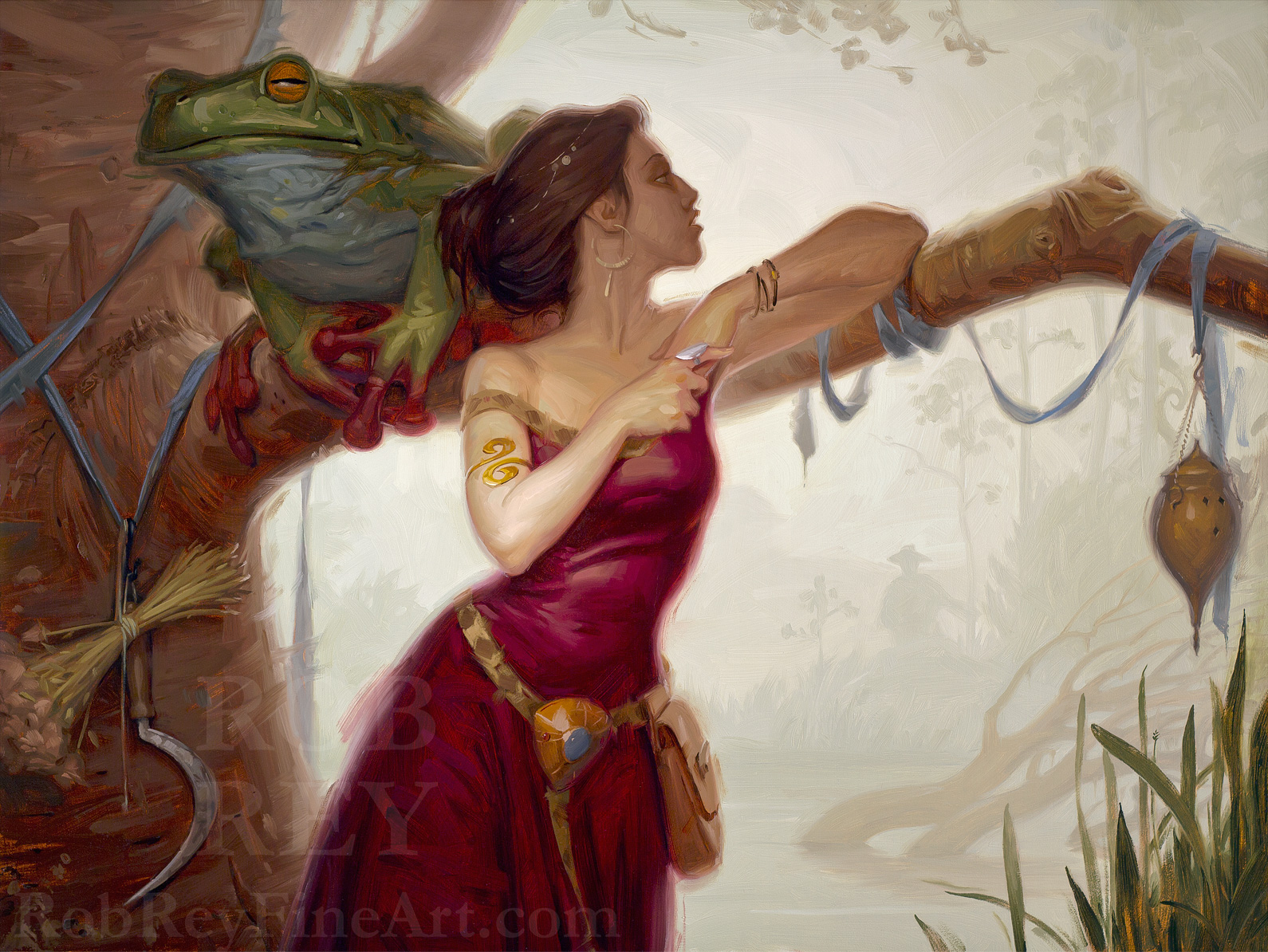 I wanted to create a story with this image. I'm drawing on many stories and fairy tales from The Frog Prince to Ulysses' encounter with Circe in The Odyssey to clue the viewer into what might be going on here. A shadowy sorceress is seen here with a few of her accoutrements. It's not a large leap to guess that this frog of unusual size may have not always been a frog. But who's that in the mist beyond? Is it someone spying upon her activities or an unfortunate soul forced to come and keep their end of a bargain?